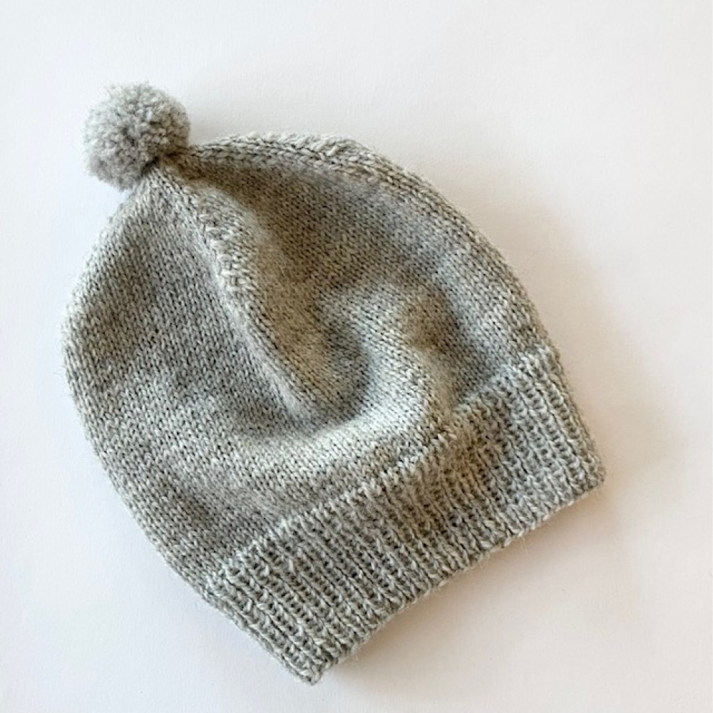 Sød og dejlig varm hue i gråt garn med en grå kvast som top. Huen har en ribkant forneden , så den sidder godt og tæt til hovedet .