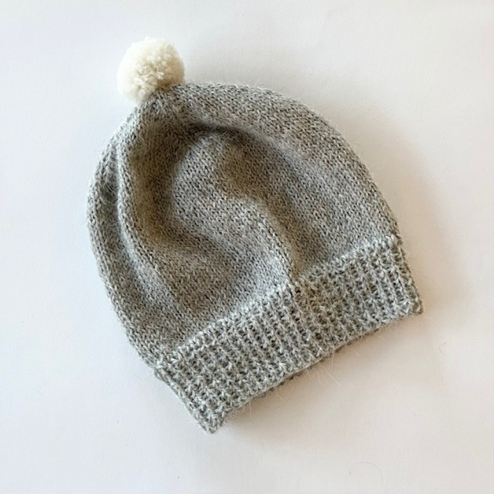 Sød og dejlig varm hue i gråt garn, med en hvid kvast som top. Huen har en ribkant forneden , så den sidder godt og tæt til hovedet .