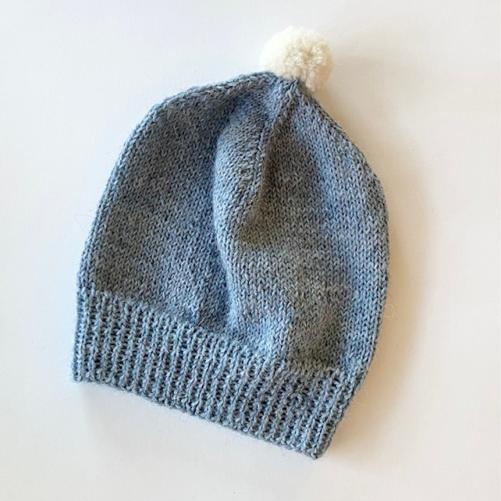 Sød og dejlig varm hue i lyseblåt garn, og med en hvid kvast som top. Huen har en ribkant forneden, så den sidder godt og tæt til hovedet .